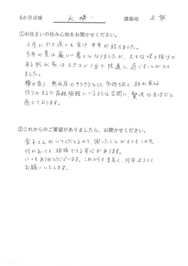 金子さんがいてくださるので、困ったことがもしもこの先何かあっても相談できる安心があります。いつもありがとうございます、これからも末永く、何卒よろしくお願いいたします。